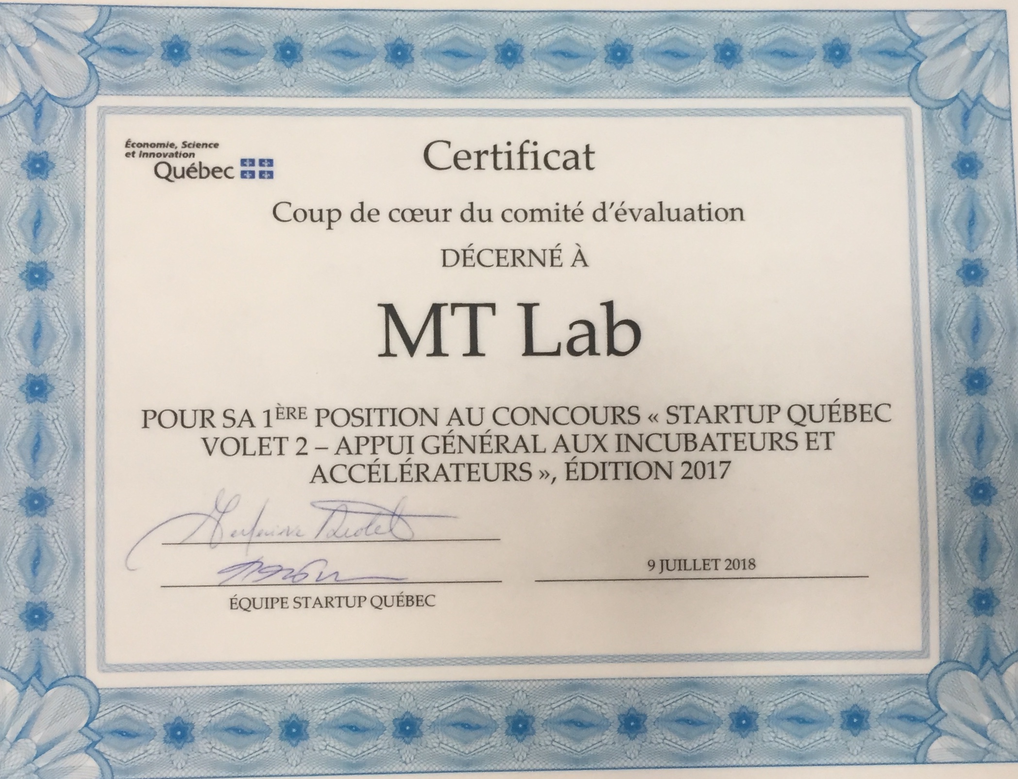 On July the 9th, just 10month after our opening, we have obtained the first position « Coup de coeur »at the gathering Startup Quebec of the Ministry of Economy, Science and Innovation alongside Centech, Startupfest and the Hub Lune Rouge.